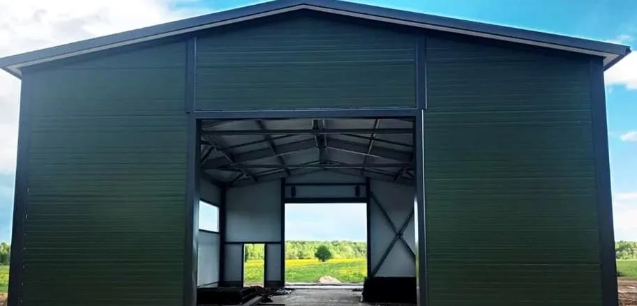 Свободное пространство вдоль стен используйте для хранения шин, навесных плугов, ковшей, прицепов и комплектующих. Сэндвич‑панели поддерживают стабильный микроклимат, защищая детали от влаги и перепадов температур.